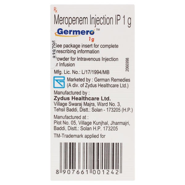 Germero 1000mg Injection is an antibiotic that is used to treat severe infections of the skin, lungs, stomach, urinary tract, blood, and brain (eg. meningitis). It works by killing the bacteria that cause these problems. However, it will not treat a viral infection.